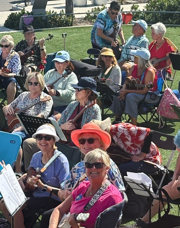 This group meets every Monday at 10:30am at Nakomis Beach in Venice. There are over a hundred ukers who go weekly, toting their chairs, music stands, and books of music. I am not a book girl - I prefer an iPad or a big screen. Also, it is a hike for us, so we only went the first Monday we were here. It is much more convenient for us to go to Lakewood Ranch with the Aloha Ukulele Club. They have a big screen and chairs for us.