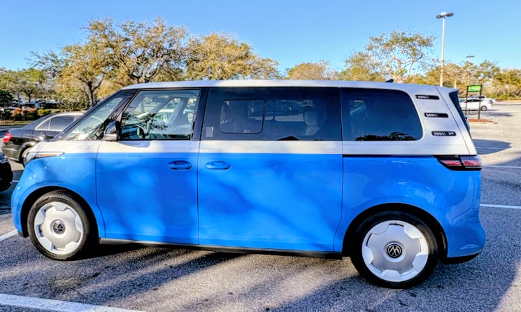 Couldn’t help but ask about it. The gentleman owner was happy to talk about it - even opened the sliding door to show us the captain chairs in the back seat. The next row back was full of his wife’s items which she sells “on the road.” When you put the captain chairs down, it becomes a massive storage space. Is it electric - yes, all electric. They have had it for a year and love it. He closed with, “Don’t buy this if you are an introvert - it always draws attention and sparks conversation.”