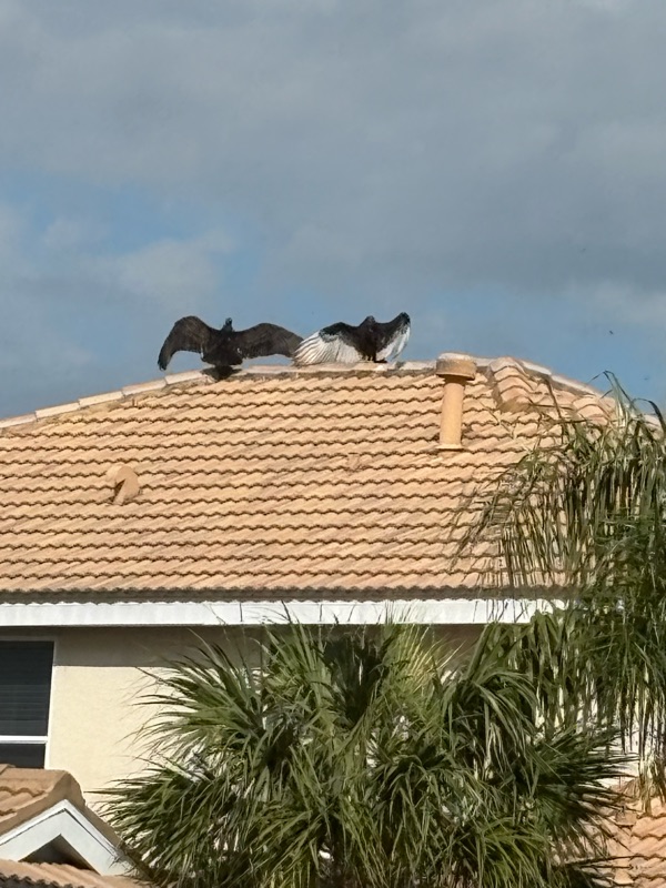 We spotted these two turkey vultures roosting on a roof - never saw white winged one before. The black ones are all over the place. No dead humans or critters in the area that I know of.