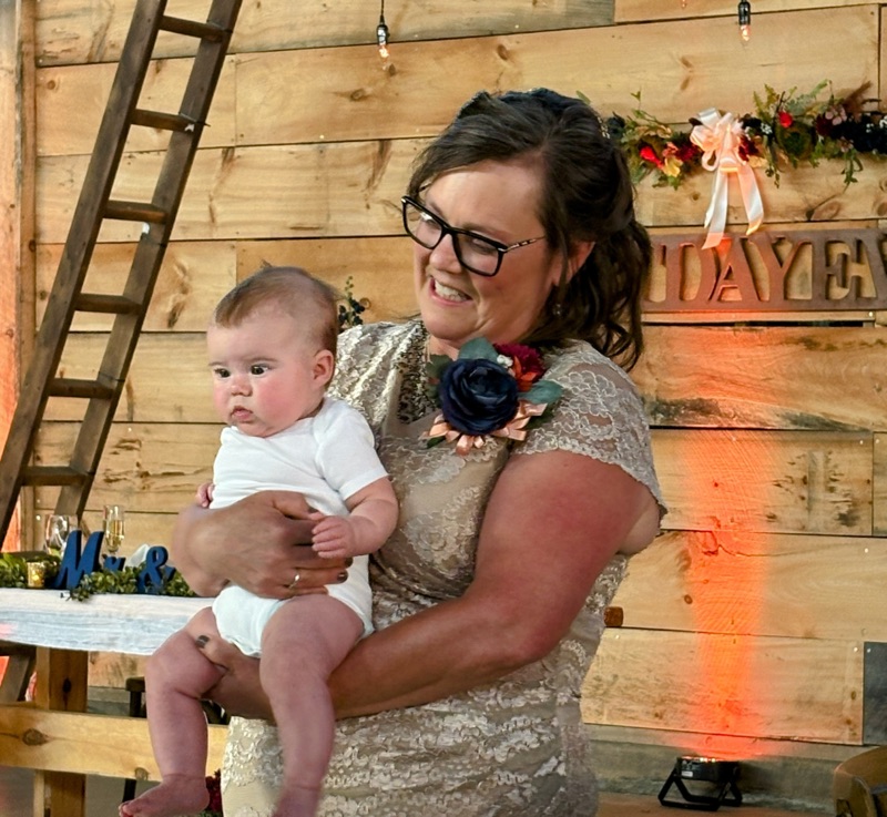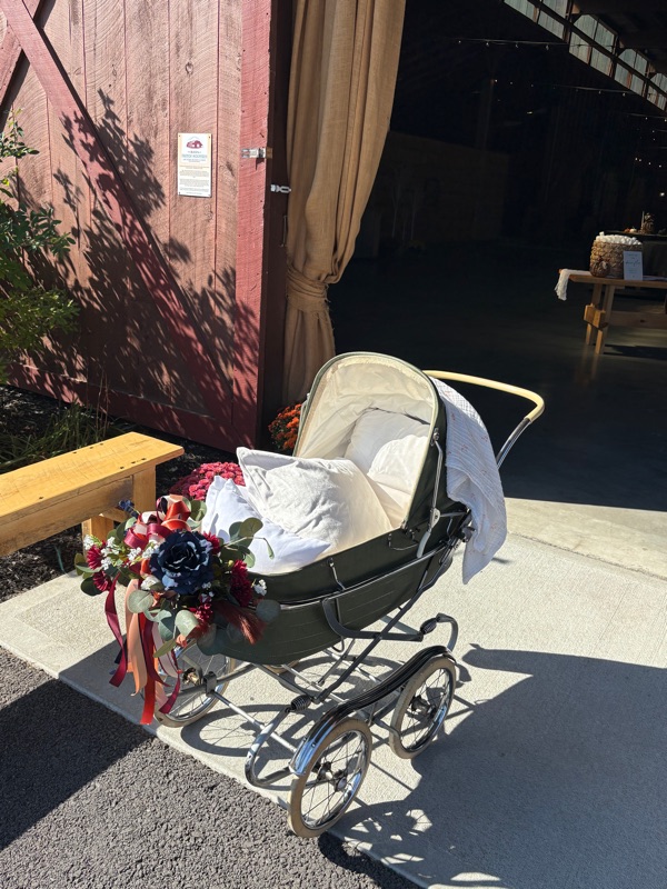 Isabella Rose (4 months old) participated in her parents’ wedding. Nora cleaned up the carriage that she and Perry were in as babies and Isabella was wheeled down the aisle…