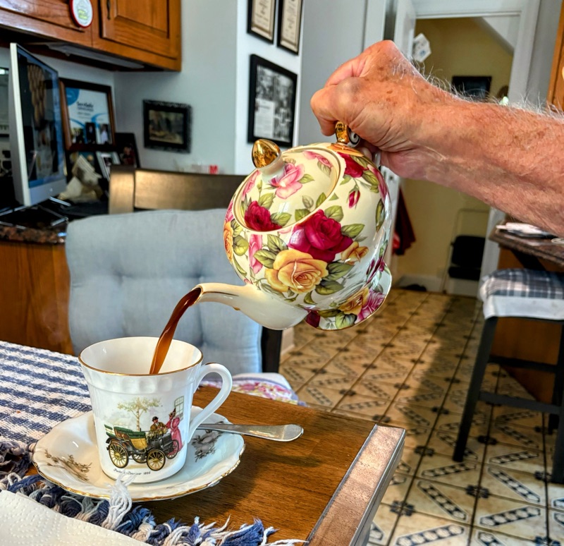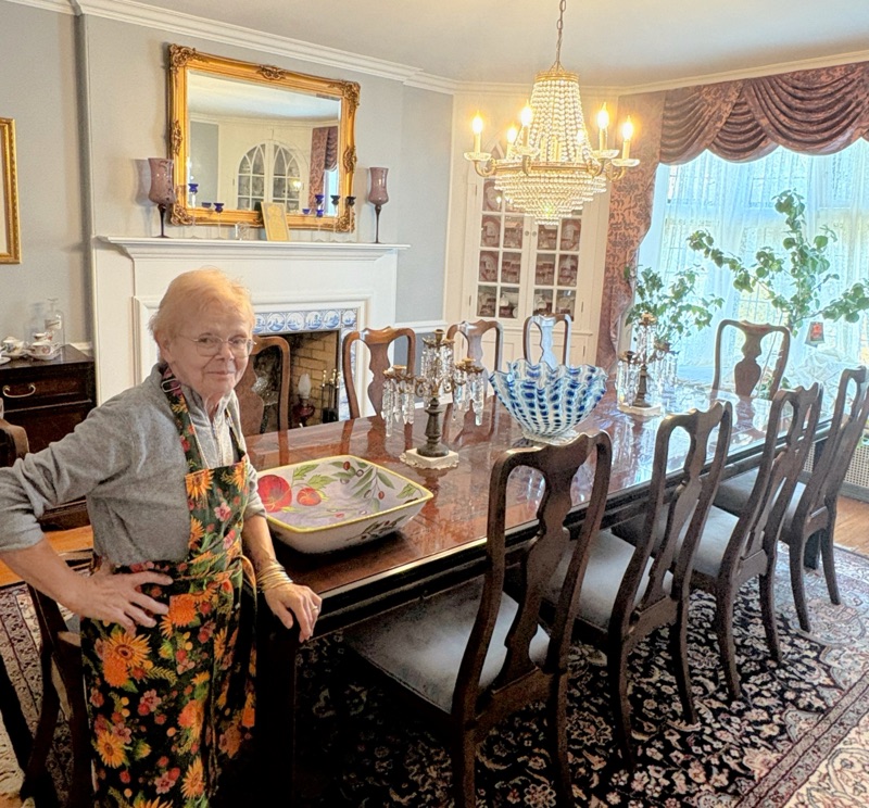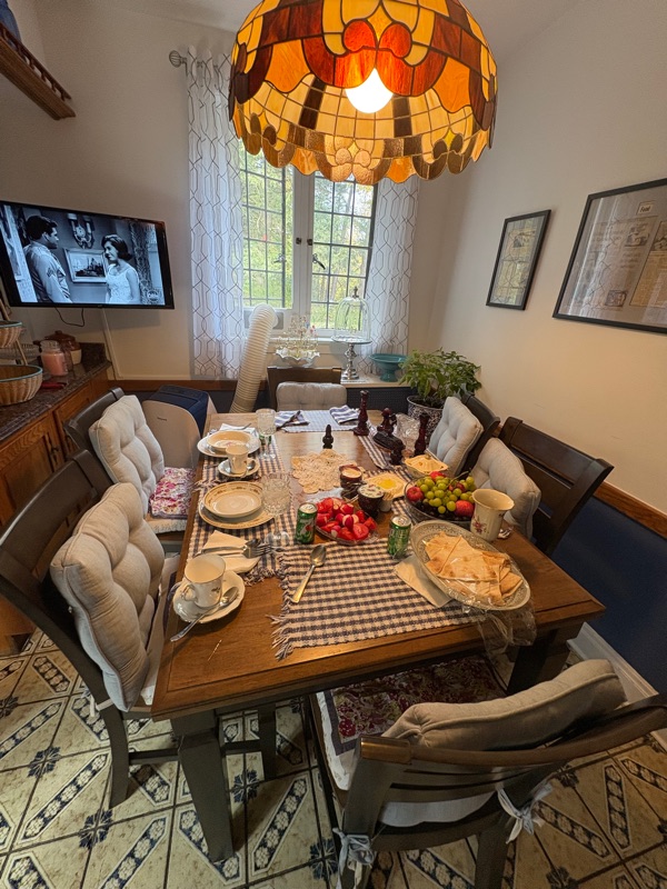 Mary’s Kitchen is fellow vendor on Saturdays at the Market. She is Rich’s age and has been a go-getter her entire life. She raised 6 kids while operating a flower/plant market and her husband, Mike, ran the adjoined convenience store. He bought her a beautiful home in Lenox. She refused to move in before it was in the condition she wanted. She knew exactly what she wanted. She had started making cakes for friends and neighbors. It grew and grew by word of mouth. She coined her logo, Mary’s Kitchen, and had a commercial kitchen built in the cellar of her home. Since then, she has been a baked goods destination for people far and wide. She invited us to visit her home before we leave for Florida, so we told her 1pm on a Monday. She said,”Don’t eat anything because I am going to feed you!” We protested and she said she would throw us out if we didn’t agree. We succumbed. She had the table all set with crystal glasses of ice water, lavash bread, yogurt, fresh tomatoes and radishes, rice with beef and beans, followed by Turkish coffee and a plate of desserts. She also gave us the leftovers and a tray of cookies, cupcakes, cheesecake, etc. This is her kitchen table…