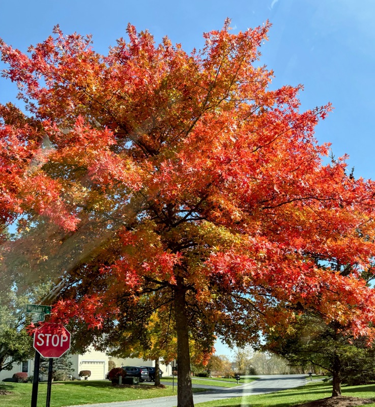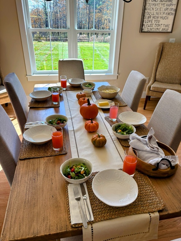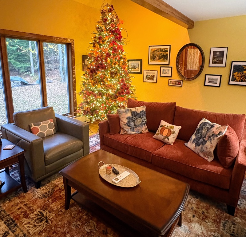 On that very same day, I already had a date to meet my Big Y friends for dinner at Tony’s house in Becket. Kim brought a delicious butternut soup, Pat brought red wine, bread, and crackers and cheese, Tony made a salad and bought turkey chili. Since my cupboards are bare in preparation for leaving, I shared Mary’s dessert plate. We had such a great visit and Tony has had so many upgrades to his house and barn, that it was like visiting Martha Stewart. He basically took the original furniture and put it in the barn, replacing it with new couches and chairs. The views were spectacular from the 3rd floor looking out over the Fall colors of Sherwood Forest. This is the TV room with a gorgeous Friendsgiving tree which will be converted to a Christmas tree.
