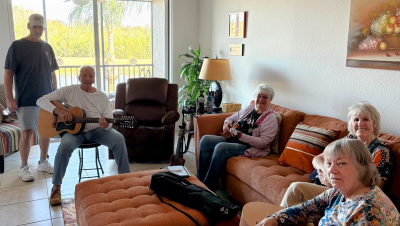 At 2pm, there were 6 jammers and as we talked more about ourselves, we discovered we are all from New England (NY, MA and CT) except for one from Ohio. Another player is definitely joining when he gets down here because he offered his house which has a studio with sound board, amps, monitors, et al. He plays professionally back home in CT.